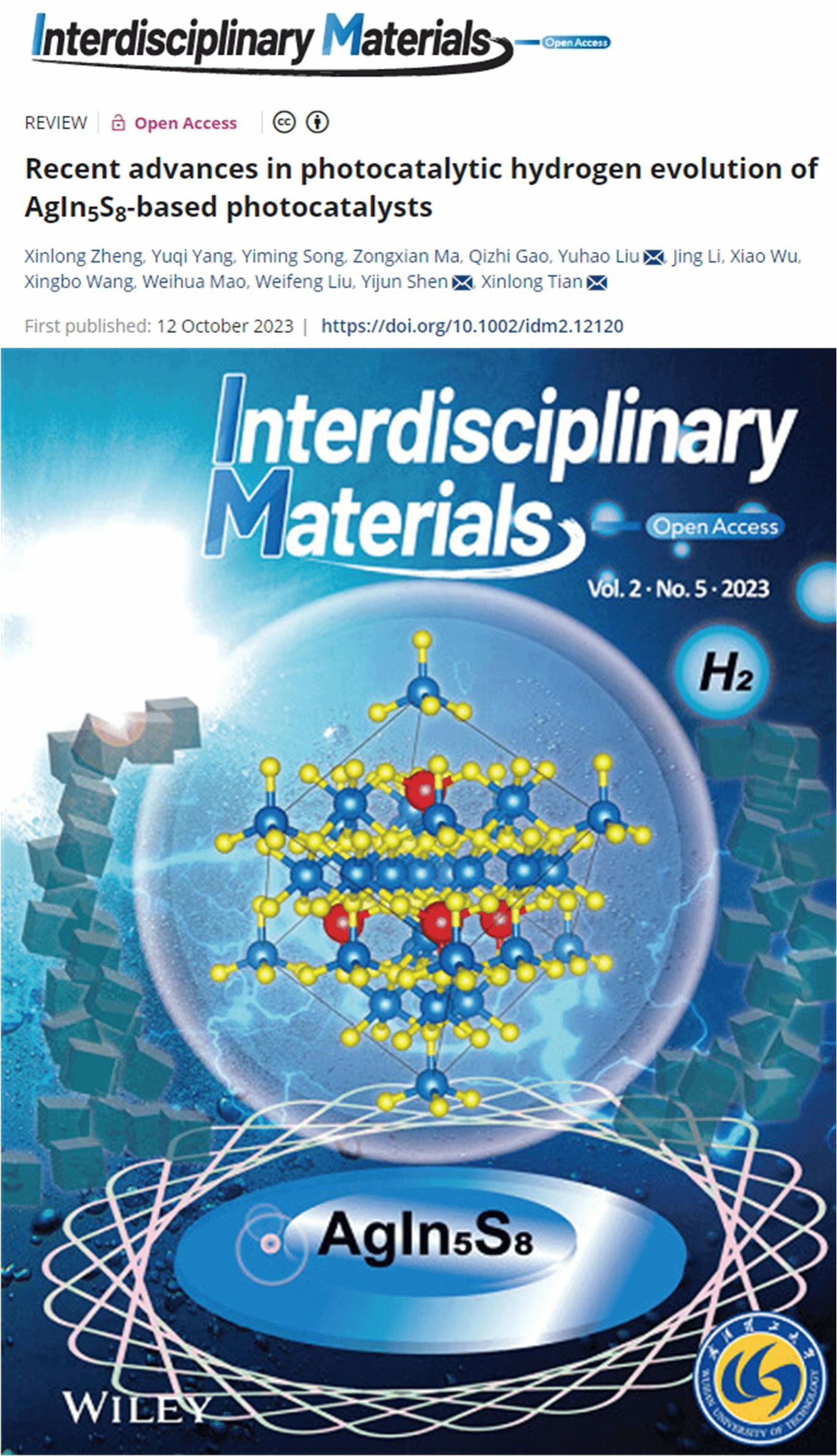 近期,欧乐影院 刘雨昊副教授所在团队撰写的综述论文《Recent advances in photocatalytic hydrogen evolution of AgIn5S8-based photocatalysts》以封面论文形式发表于中国科技期刊卓越行动计划高起点新刊《Interdisciplinary Materials》。欧乐影院 2022级化学工程与技术专业博士研究生郑馨龙为论文第一作者;欧乐影院 刘雨昊副教授、海洋科学与工程学院沈义俊教授、田新龙教授为论文共同通讯作者。