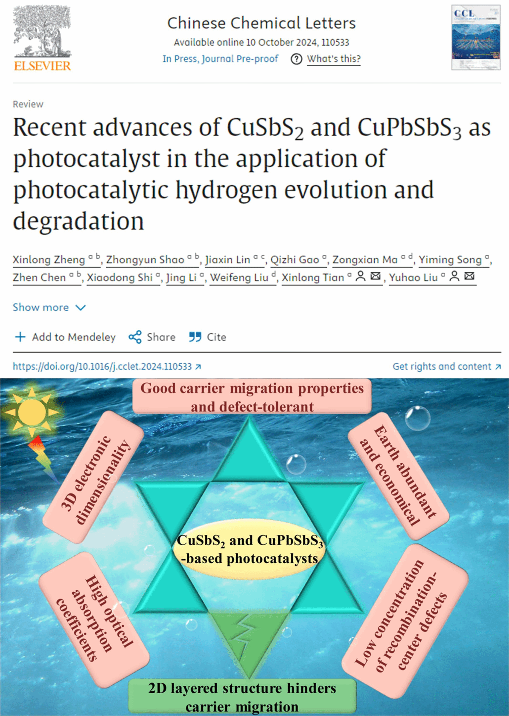 刘雨昊副教授所在团队在能源化学领域Top期刊《Chinese Chemical Letters》发表题为《Recent advances of CuSbS2 and CuPbSbS3 as photocatalyst in the application of photocatalytic hydrogen evolution and degradation》的综述论文。欧乐影院