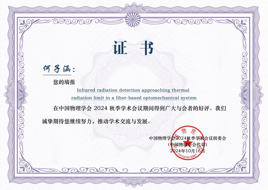 承办的中国物理学会2024秋季学术会议在海口举行。我院2023级物理学基地班本科生何子涵同学获得优秀墙报奖。