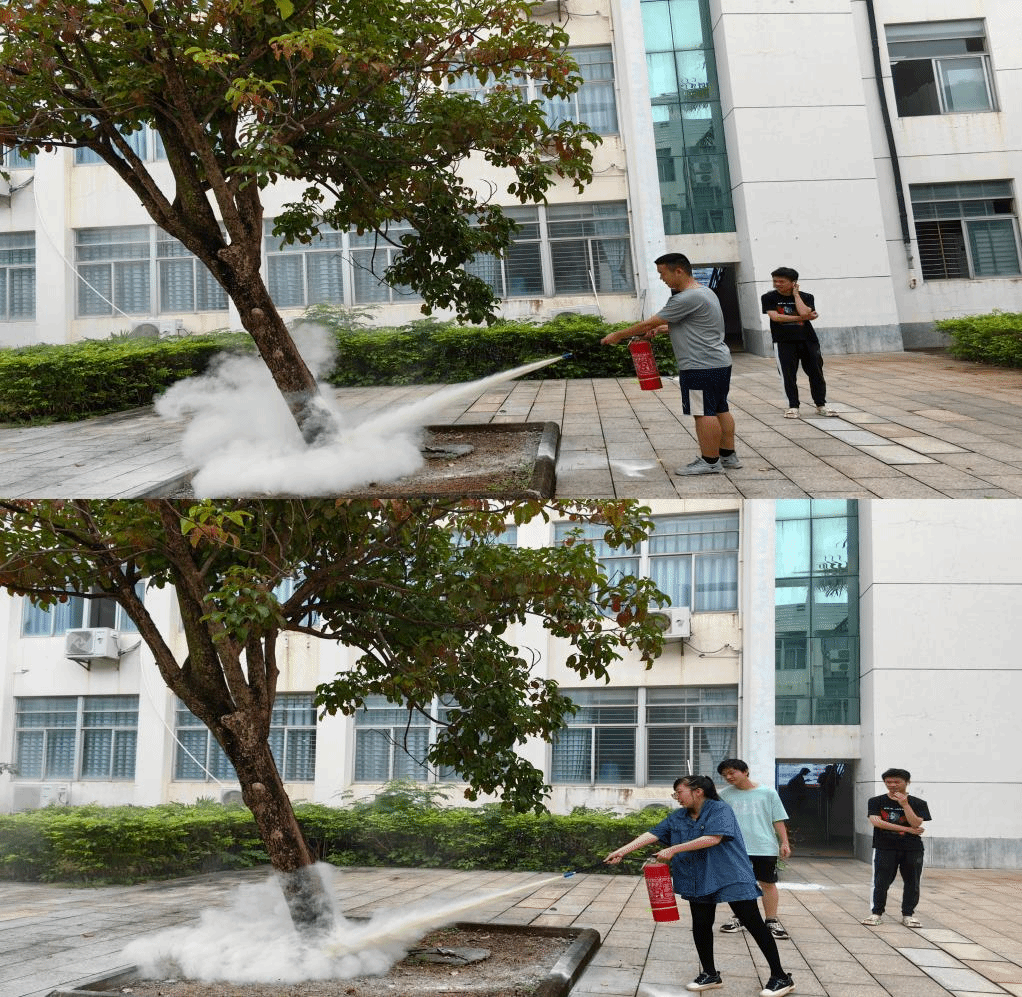 基础物理实验教学中心主任陈文钦对实验室内气瓶、灭火器和灭火毯等消防器材开展了重点检查。陆溪老师为学生讲解灭火器的使用方法,并在基础实验楼前空地现场使用灭火器进行消防灭火演练。